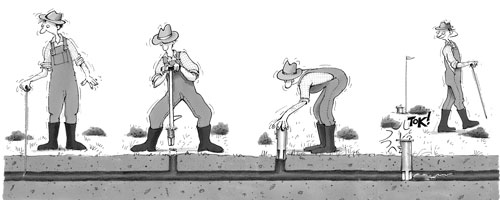 Pour trouver une galerie de campagnols, enfoncez votre sonde de 10 à 15 cm, tout les 5 cm, dans les environs immédiats d’une taupinière fraîche. Dès que vous êtes tombé sur un vide, agrandissez le trou à l’aide de la sonde afin de pouvoir introduire un doigt dans la galerie et repérer ainsi sa position exacte. Evitez d’écraser les galeries de vos pas.